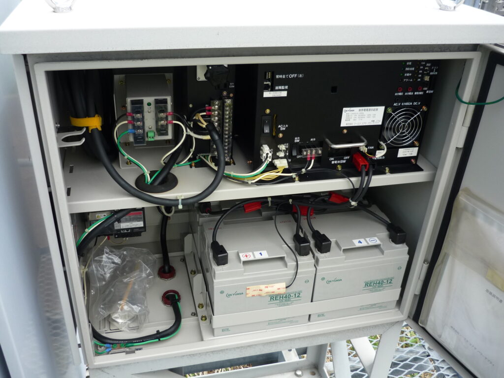 実はその陰でカメラの電力バックアップ用でも無停電電源装置が使用されています。落雷、地震等の災害による停電時にも安定した電力を供給できるよう各所に設置されています。実際はただの箱のように見えますがその中にはインバータ・バッテリーが搭載されており負荷への電力供給をしています。
