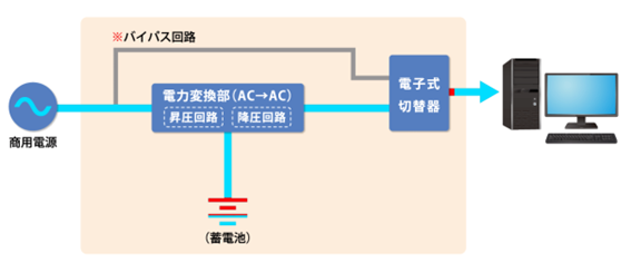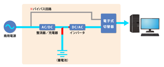 - 停電の有無にかかわらず、常にUPSのバッテリーを通して電気を送り、安定した電力を提供