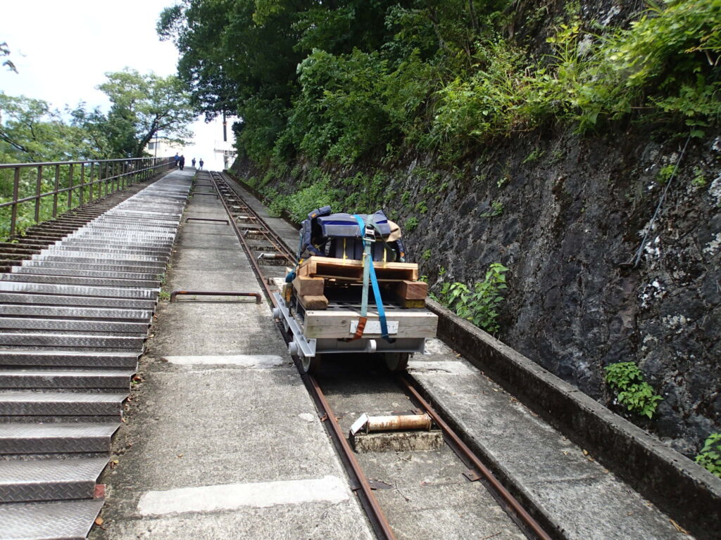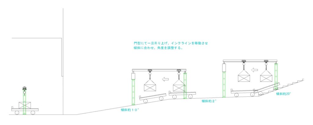 今回の工事箇所ではインクラインでの運搬方法しかありません。